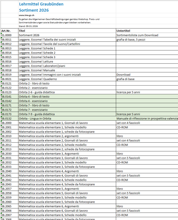 Lehrmittelliste in Excel-Tabellenblättern, zum Erstellen eigener Bestelllisten.